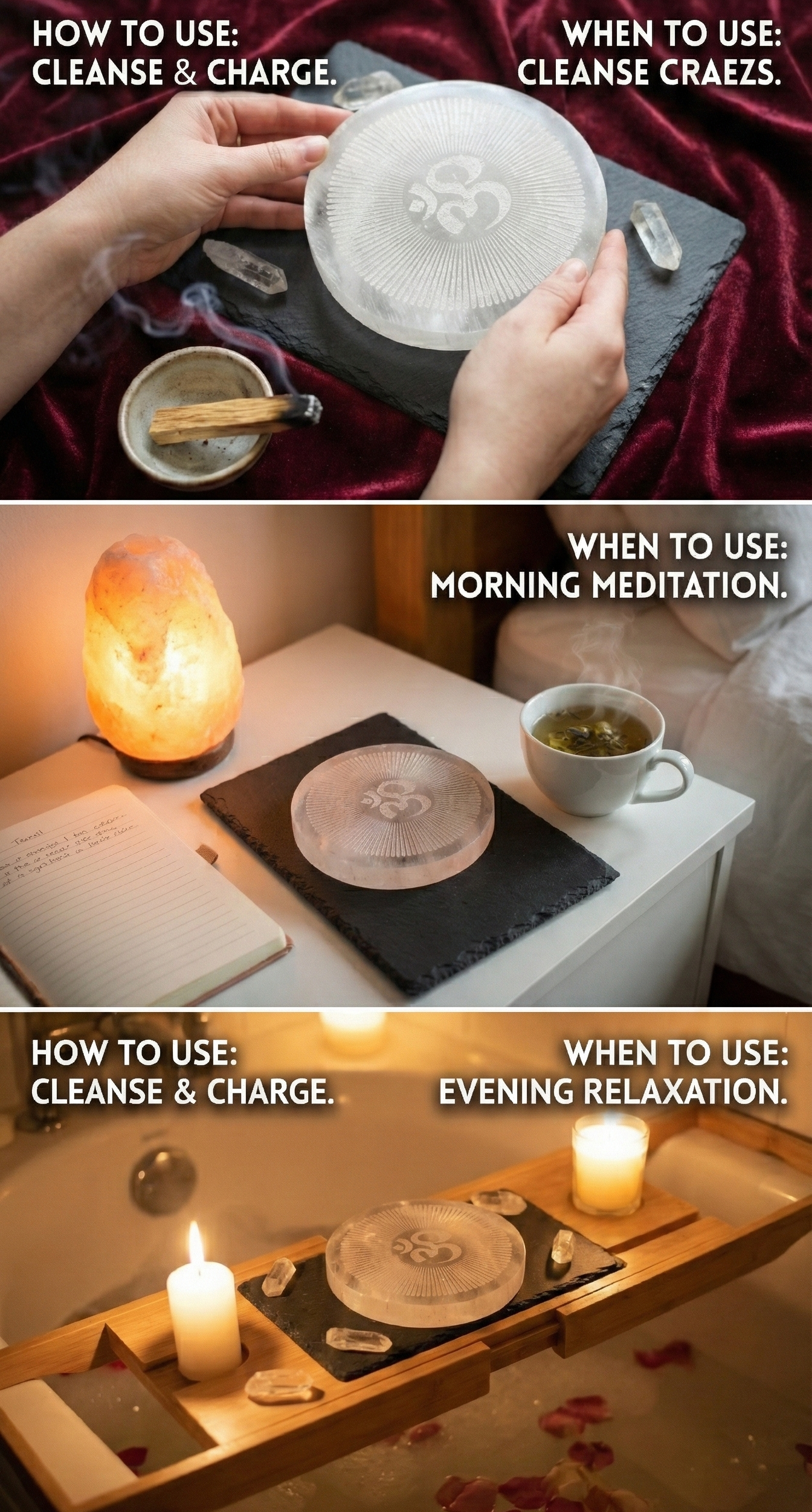 Cleanse & Amplify: Selenite acts as an energetic eraser. Place your crystal bracelets, malas, or stones on the plate to strip away accumulated heavy energy and recharge them with high-frequency vibrations.
